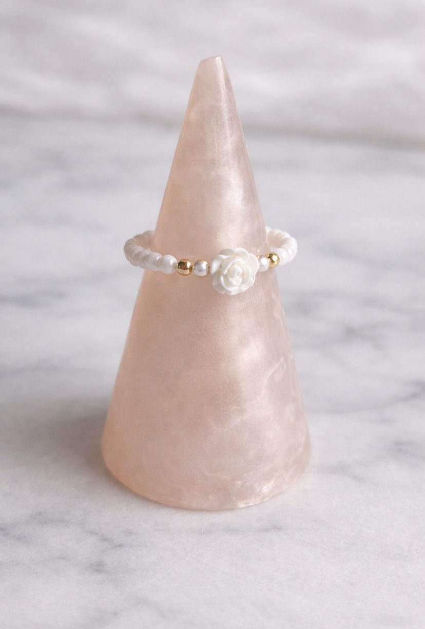 Centralnym elementem jest misternie wykonana różyczka z żywicy, która nadaje całości romantycznego charakteru.